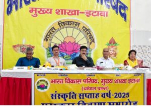 इटावा। स्थानीय नारायण वैकट हाल में भारत विकास परिषद् मुख्य शाखा इटावा के तत्वावधान में आयोजित संस्कृति सप्ताह कार्यक्रम पुरस्कार वितरण के साथ सम्पन्न हुआ। कार्यक्रम के मुख्य अतिथि वरिष्ठ पुलिस अधीक्षक श्री बृजेश कुमार श्रीवास्तव, विशिष्ट अतिथि क्षेत्रीय संरक्षक आर. बी. श्रीवास्तव, राष्ट्रीय प्रकाशन समिति की पूर्व अध्यक्ष डा. चम्पा श्रीवास्तव और क्षेत्रीय गतिविधि संयोजक सेवा विवेक कुलश्रेष्ठ के साथ शाखा अध्यक्ष हरी शंकर त्रिपाठी भी मंचासीन रहे। मंचासीन अतिथियों ने भारत माता और स्वामी विवेकानन्द जी के चित्रों पर माल्यार्पण कर दीप प्रज्ज्वलित किया।